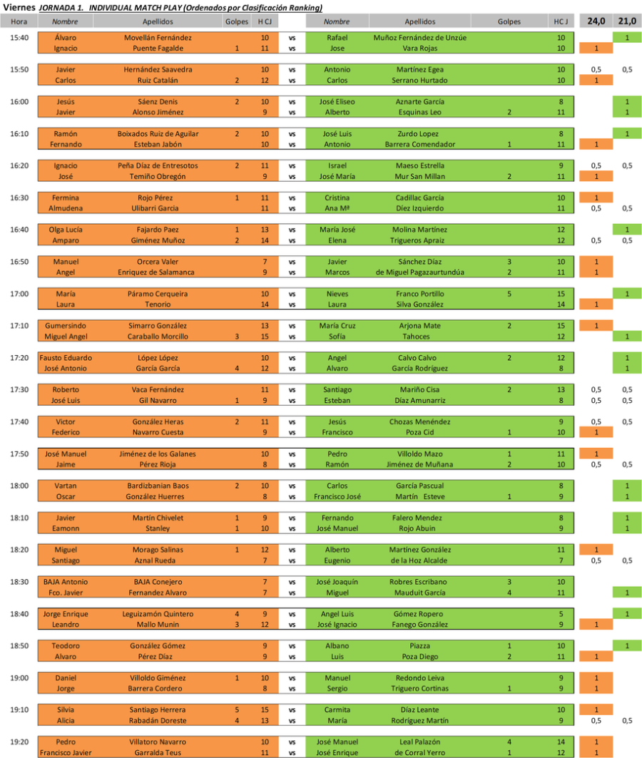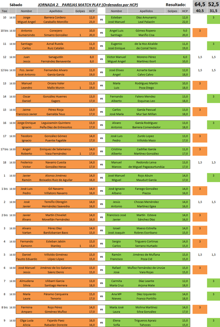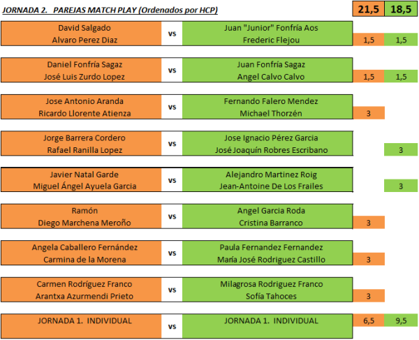 Jugarán 1º Naranja vs 1º Verde por orden de Handicap.